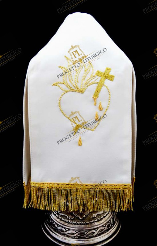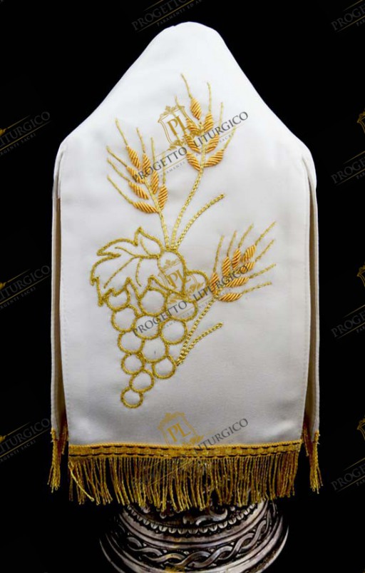 Ciascun lato del conopeo della Pisside è rifinito con un prezioso agremano color oro antico pazientemente cucito a mano, per mettere in risalto il ricamo e per donare preziosità a questo conopeo della Pisside.