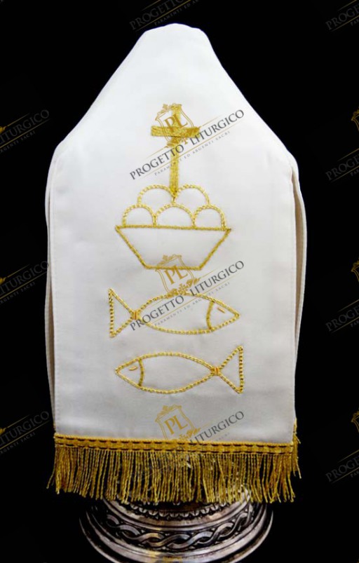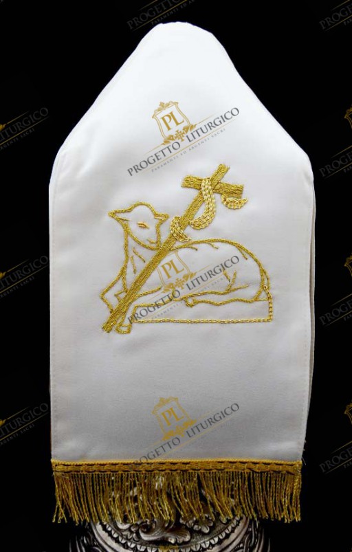 E' decorato con un delicato ricamo floreale questo conopeo della Pisside dalla forma poligonale realizzata in preziosa seta shantung foderata con raso bianco. Ciascuno dei quattro lati che costituiscono il conopeo è ricamato con filato di colore oro bianco. Al centro di ogni lato il ricamo floreale mette in risalto un elemento simbolo di Cristo: una croce gigliata con al centro un piccolo cristallo verde, un Cristogramma, il Calice eucaristico e l'Agnello.