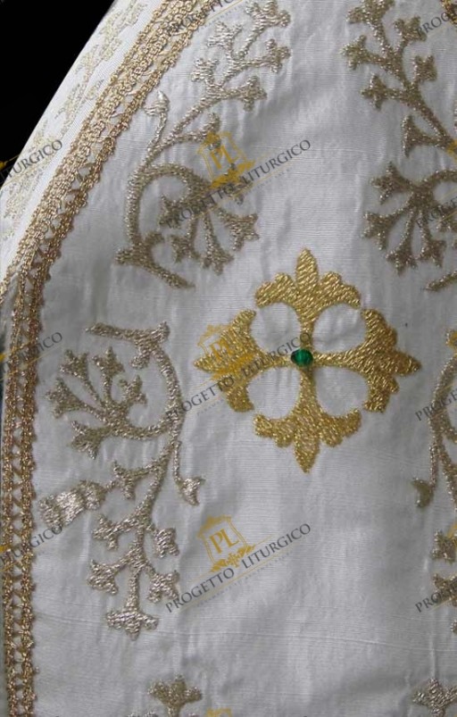 E' decorato con un delicato ricamo floreale questo conopeo della Pisside dalla forma poligonale realizzata in preziosa seta shantung foderata con raso bianco. Ciascuno dei quattro lati che costituiscono il conopeo è ricamato con filato di colore oro bianco. Al centro di ogni lato il ricamo floreale mette in risalto un elemento simbolo di Cristo: una croce gigliata con al centro un piccolo cristallo verde, un Cristogramma, il Calice eucaristico e l'Agnello.
