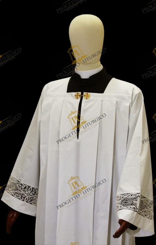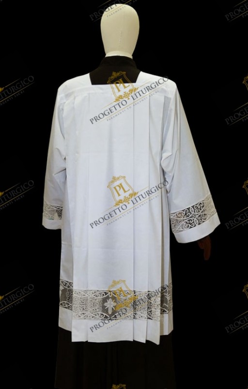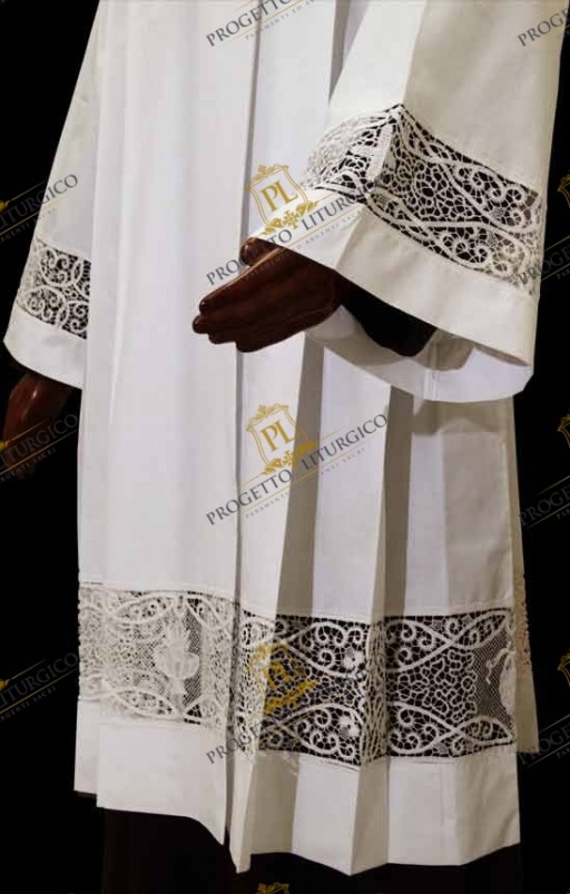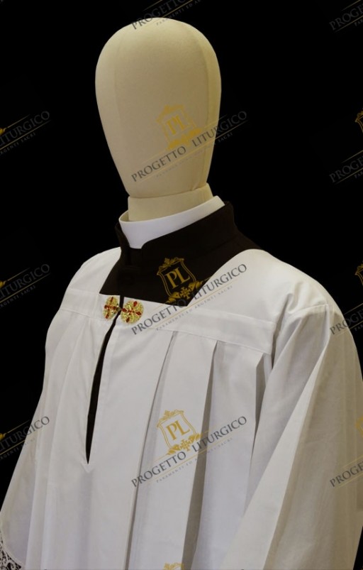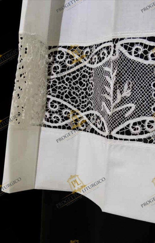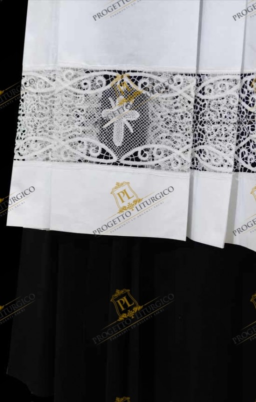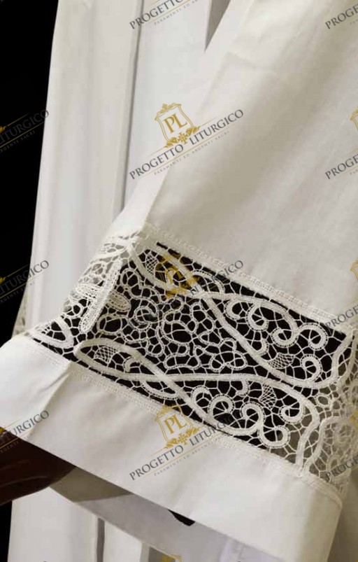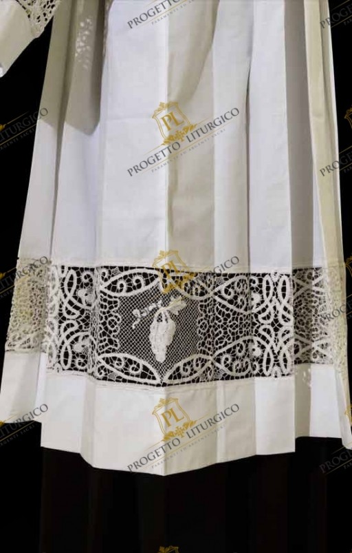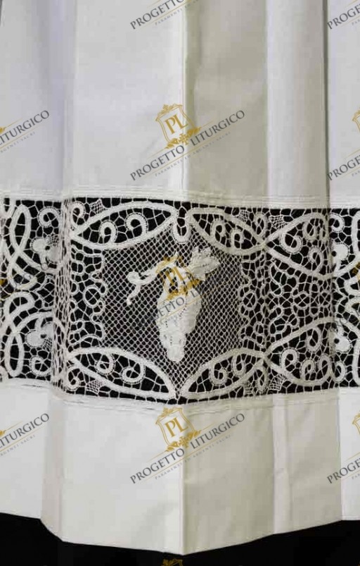 Ciò che rende particolarmente grazioso questo rocchetto sono i tramezzi in pregiato pizzo cantù che decorano le maniche e il fondo in tutta la sua ampiezza. All'interno dei motivi decorativi che caratterizzano il pizzo cantù sono inseriti simboli cristiani, quali la croce, il ramo d'ulivo, il grappolo d'uva.