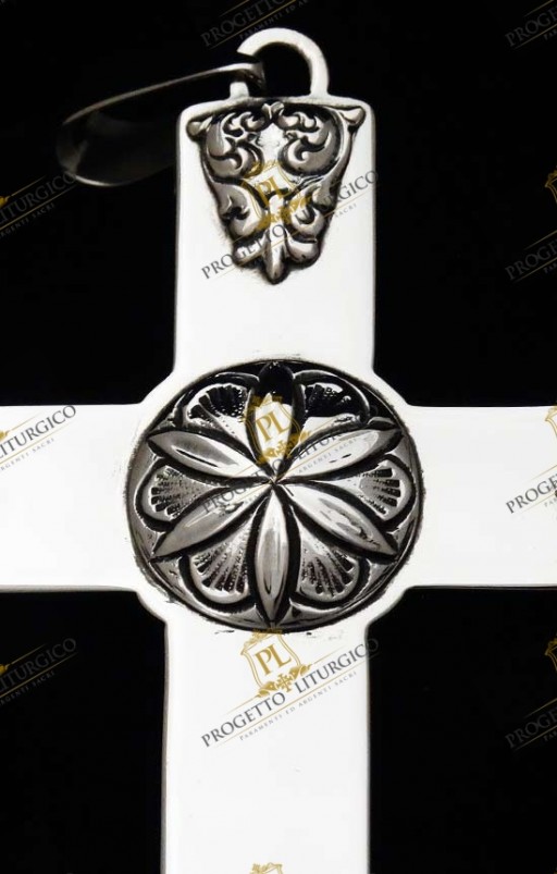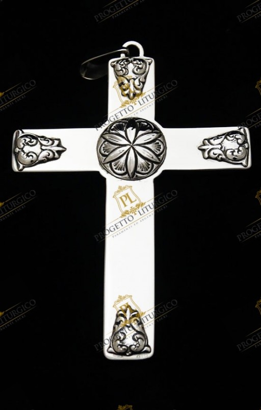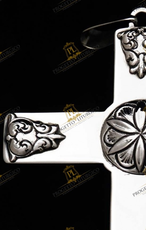 La croce pettorale vescovile è realizzata interamente in argento cesellato a mano. La decorazione della croce è molto semplice costituita da un motivo floreale centrale e da eleganti elementi decorativi barocchi collocati alle estremità dei bracci della croce. Questa particolare decorazione rende la croce pettorale vescovile molto luminosa.