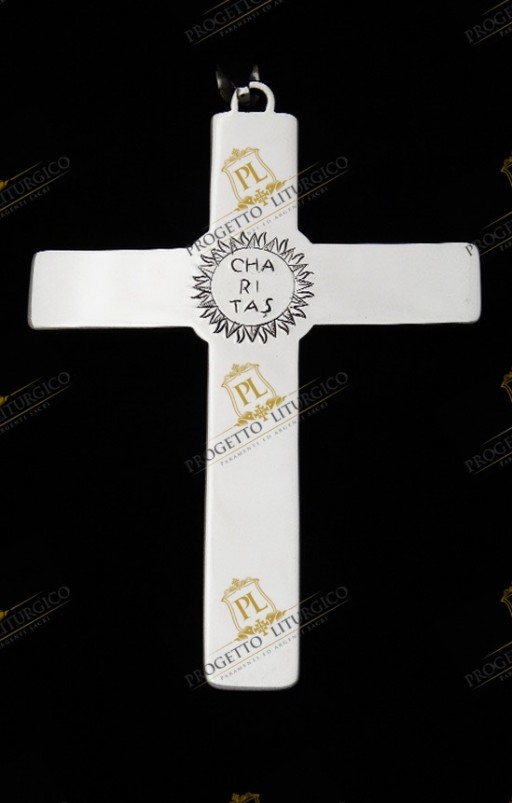 Nella parte posteriore della croce pettorale vescovile è stato inciso il simbolo della carità, un sole con la parola latina "charitas".