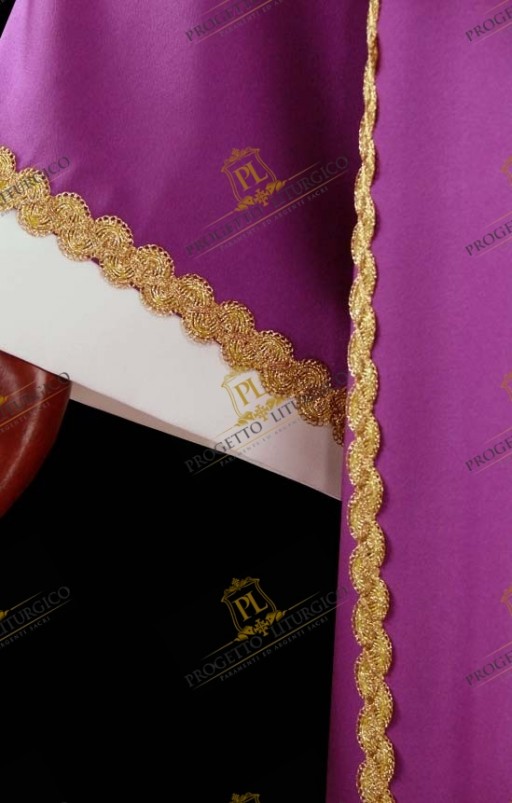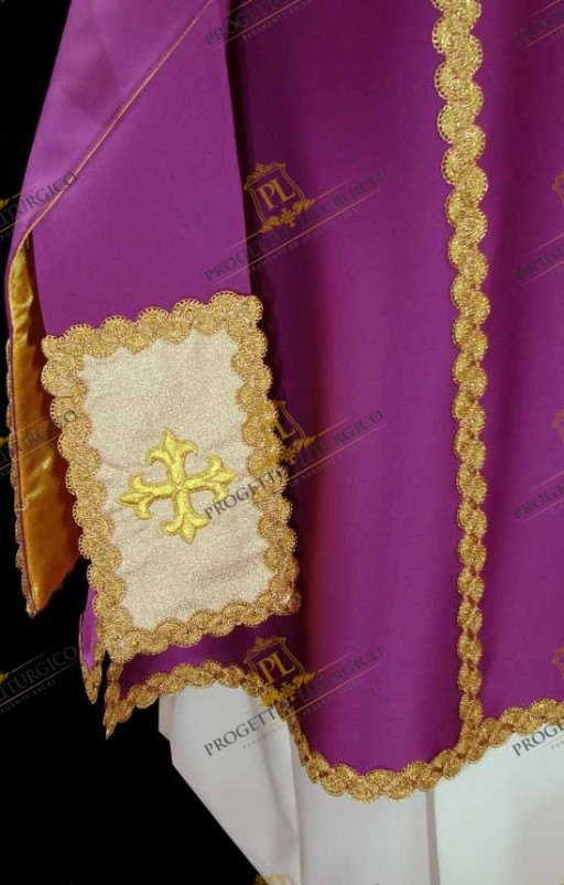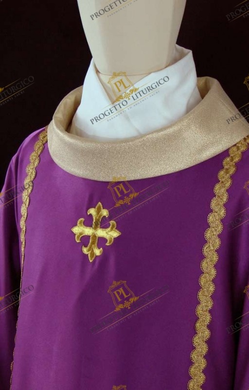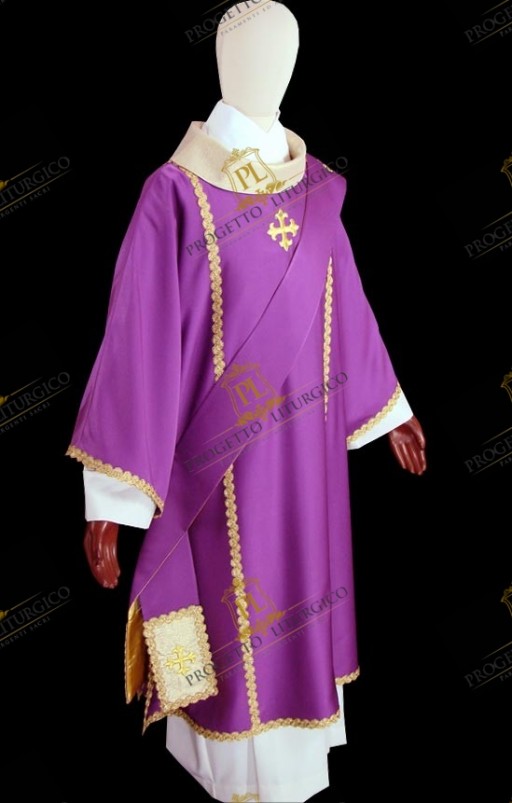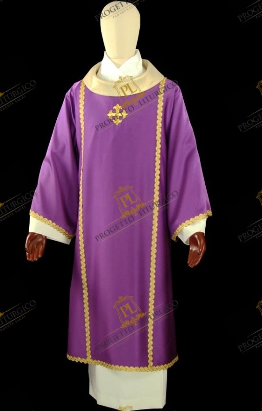Anche il diacono deve avere il suo paramento sacro adeguato al tempo liturgico, per cui per lui proponiamo questa splendida dalmatica morello realizzata in morbido tessuto cady di misto seta con collo tondo in lana papale dorata.
