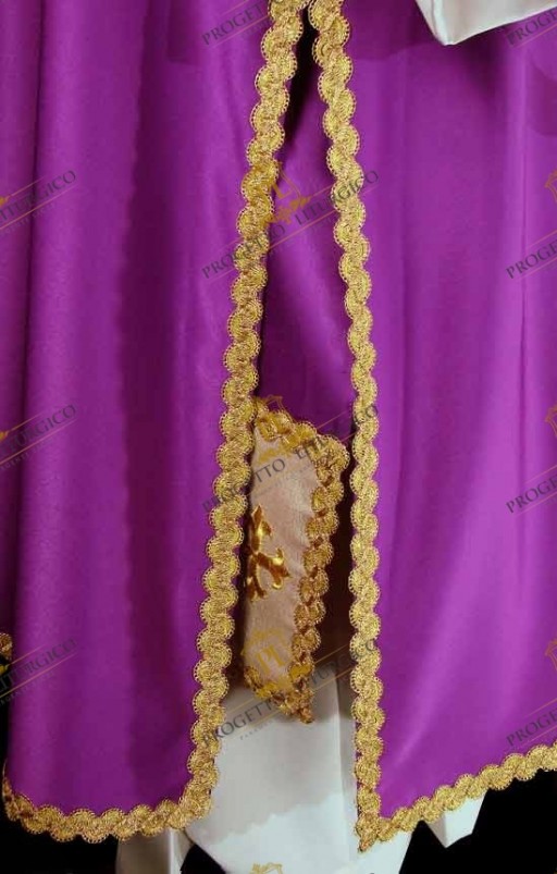 A rendere particolarmente preziosa questa dalmatica morello vi è l'agremano dorato dal disegno ondulato che corre lungo tutto il bordo del capo, rifinisce gli spacchi e impreziosisce le maniche della dalmatica.