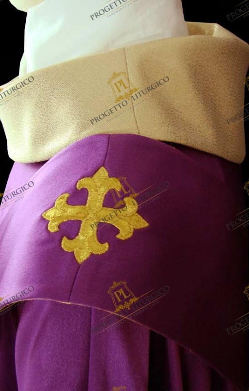 La dalmatica morello è completa di stola diaconale incrociata, decorata su entrambi i lembi con la stessa croce ricamata sul davanti del paramento sacro. La particolarità della stola diaconale sta nel fatto che ricalca l'antico modello della stola incrociata.