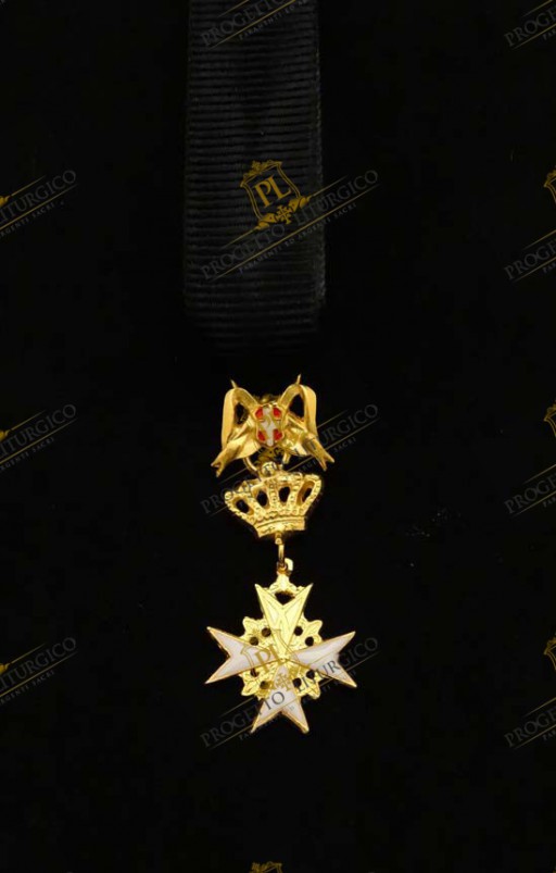 The Miniature for Donat of Devotion is the reproduction of the Cross of 16 mm, surmounted by a Bow which is charged by the escutcheon and the Crown, hanging from a black silk ribbon of 13 mm.