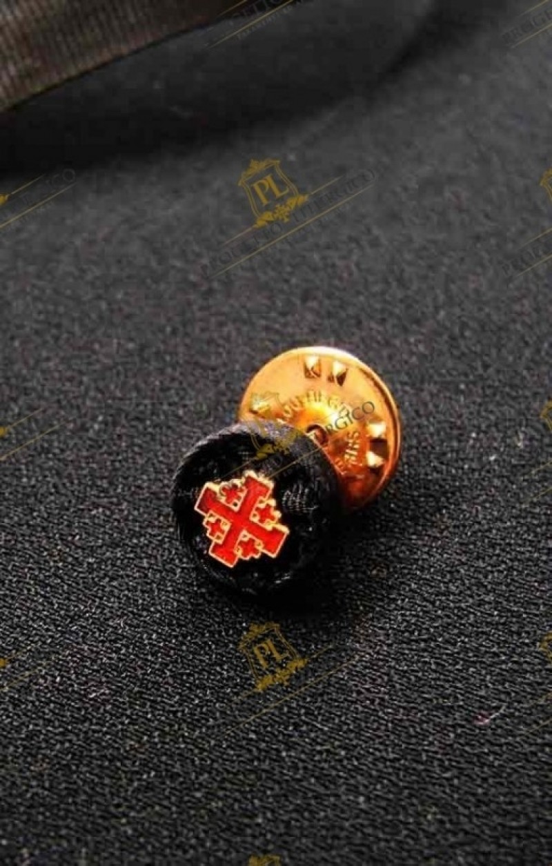- 1 piece Rosette Lapel Pin for Knight Holy Sepulchre Jerusalem with a small Cross of Godfrey of Bouillon enamelled in red placed on a black silk rosette with a diameter of 10 mm.