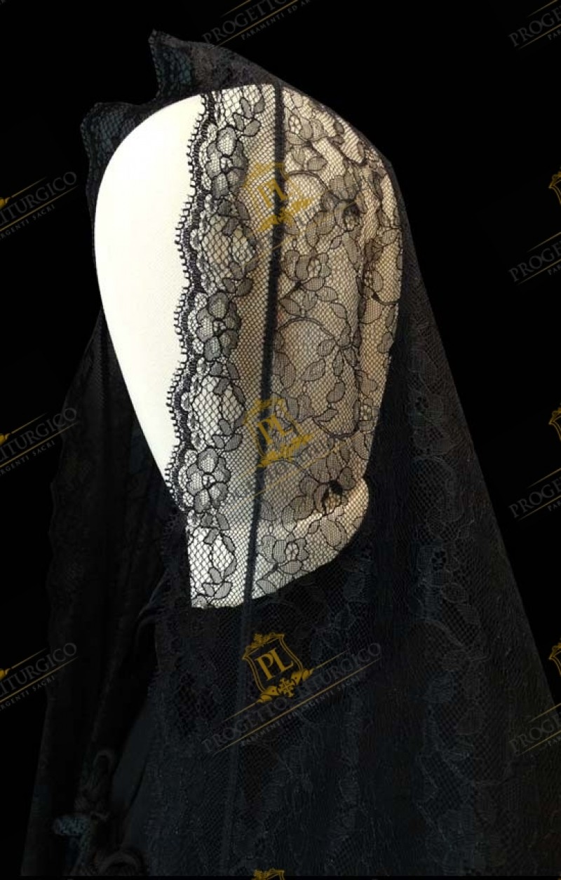 The black veil for Lady Equestrian Order Holy Sepulchre is in Italian lace with floral motifs and has a rectangular shape measuring 134 cm by 61 cm