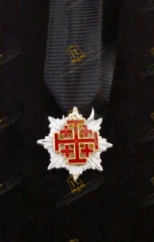 The Miniature Insignia for Knight Grand Cross Holy Sepulchre (KGCHS) consists of a small eight pointed silver star charged with a large Jerusalem cross is worn on the left breast. It is suspended from a narrow black silk ribbon. It has the appearance of a traditional miniature military medal and is worn in place of the neck insignia.