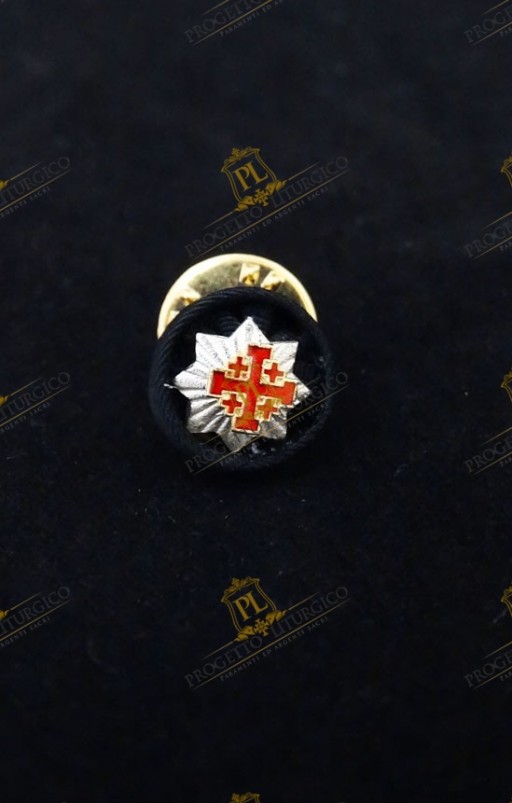 Rosette lapel pin for Knight Grand Cross Holy Sepulchre (KGCHS) consists of a small eight pointed Star charged with a large Jerusalem cross is worn on the left breast, placed on a black silk rosette with a diameter of 1,2 cm.