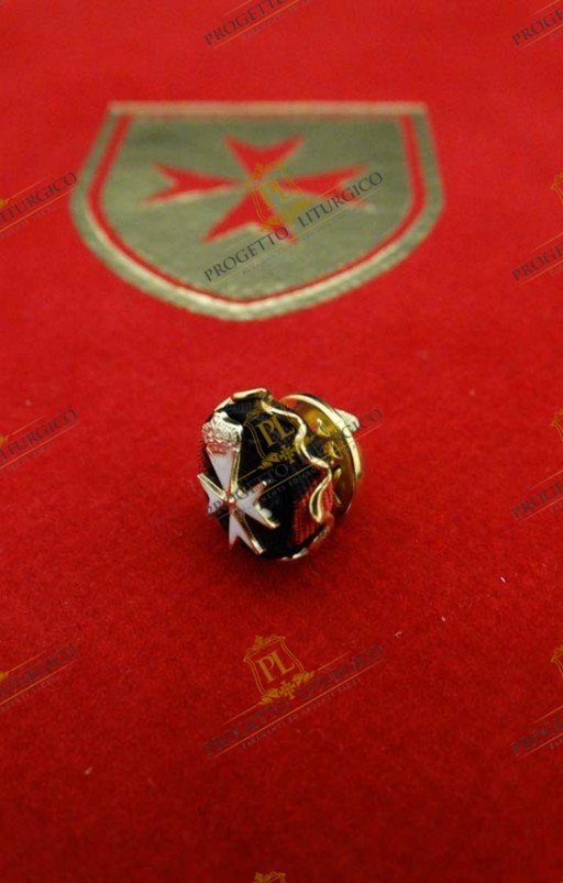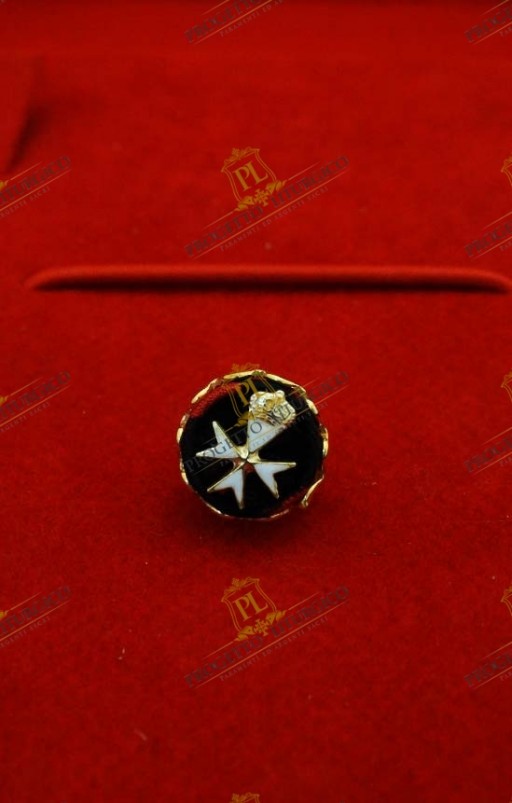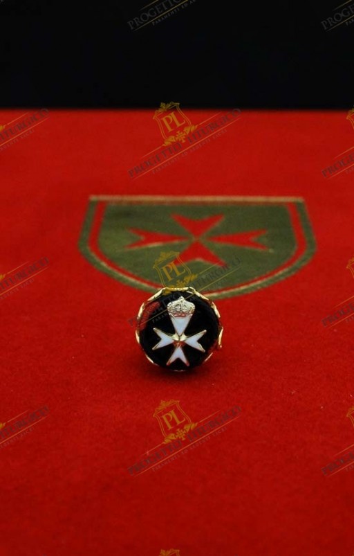 The rosette for the Knight Grand Cross of Magistral Grace with Sash of Order of Malta is composed by the octagonal cross surmounted by the Crown in the centre of a black silk rosette with red edgings surrounded by a gilded, metallic, corksrewtrimming.