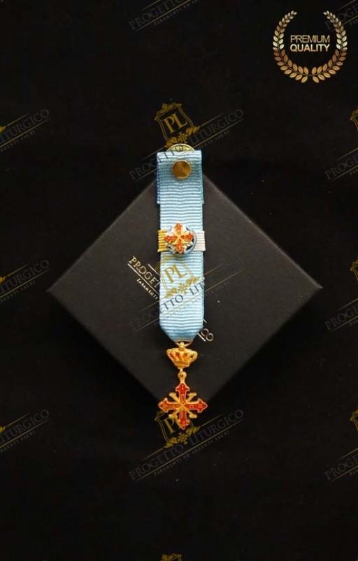 The miniature Insignia for Grand Officer of Merit Sacred Military Constantinian Order of Saint George - Franco - Napolitan Branch is made of a riband of sky-watered silk having an undy (wavy) moiré pattern ( width 13 mm) from which it hangs a little gold Greek Cross “fleury” enameled deep crimson, charged at the four extremities with the letters I. H. S. V. (In Hoc Signo Vinces), displaying at its center the monogram XP and, on the transverse arms of the Cross, the Greek letters Alpha (A) and Omega (Ω).