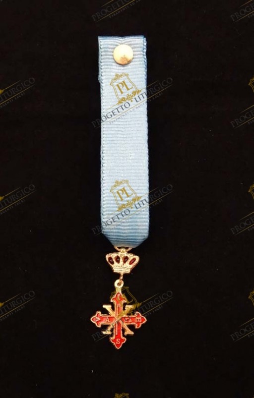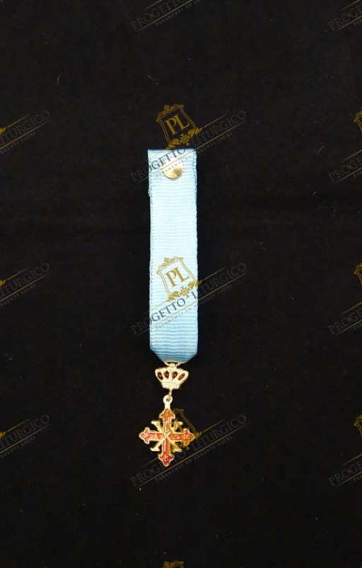 The miniature Insignia For Knight of Merit Sacred Military Constantinian Order of Saint George - Franco - Napolitan Branch is made of a riband of sky-watered silk having an undy (wavy) moiré pattern ( width 13 mm) from which it hangs a little gold Greek Cross “fleury” enameled deep crimson, charged at the four extremities with the letters I. H. S. V. (In Hoc Signo Vinces), displaying at its center the monogram XP and, on the transverse arms of the Cross, the Greek letters Alpha (A) and Omega (Ω).