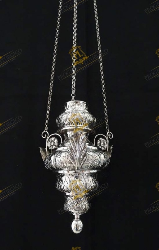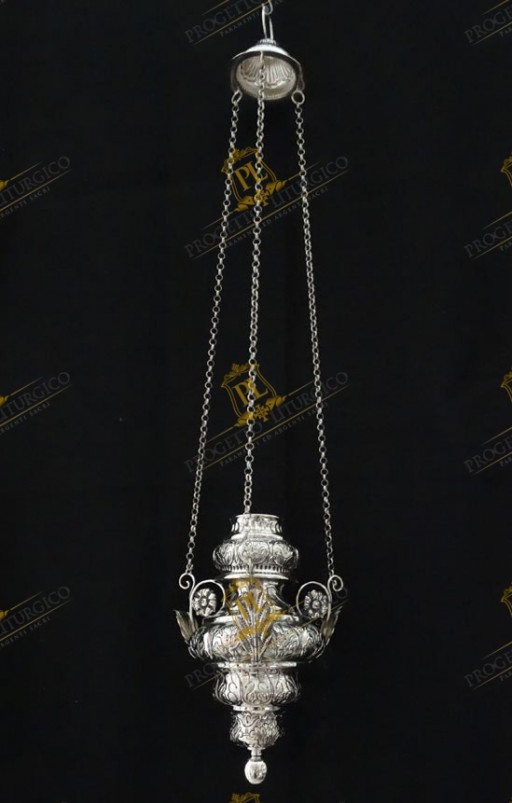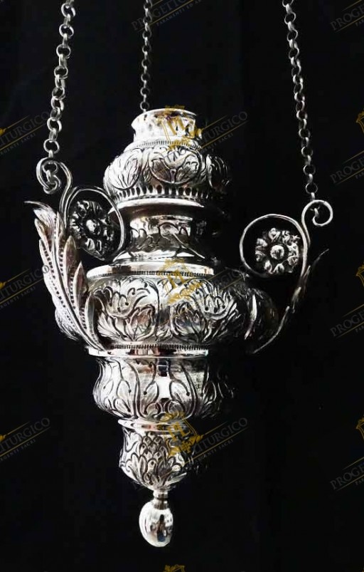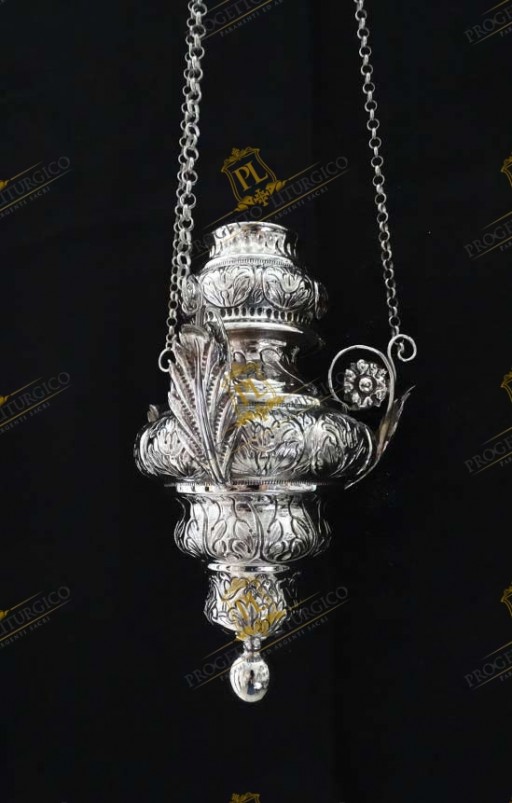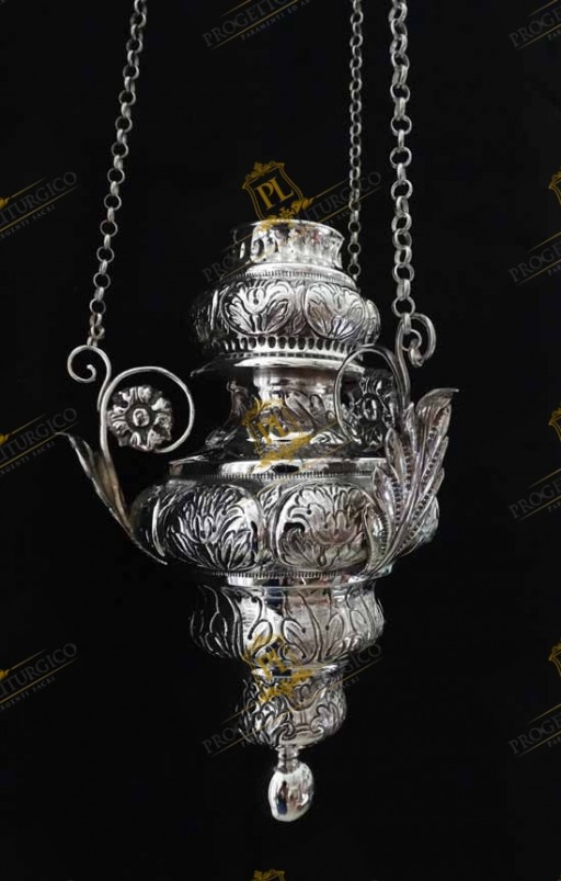 Ecco dunque magistralmente cesellati motivi floreali, messi in risalto da un sapiente lavoro di brunitura dell'argento.