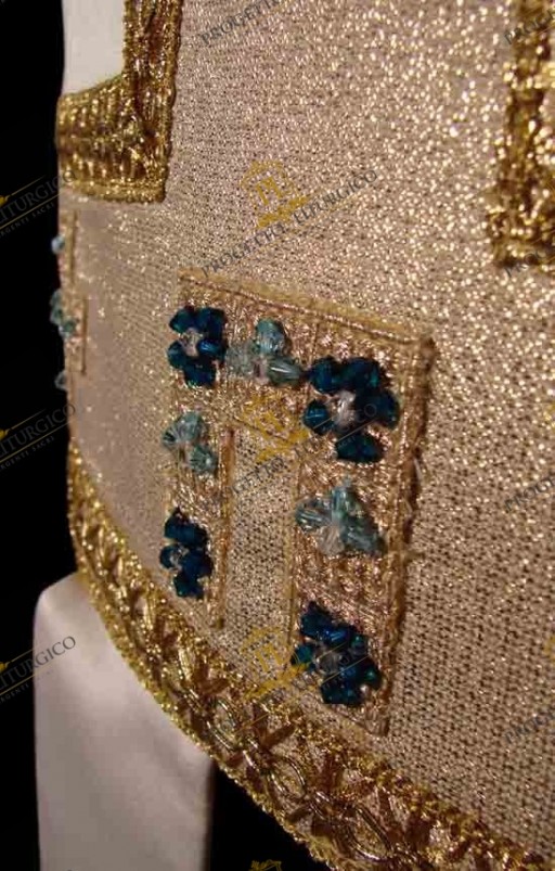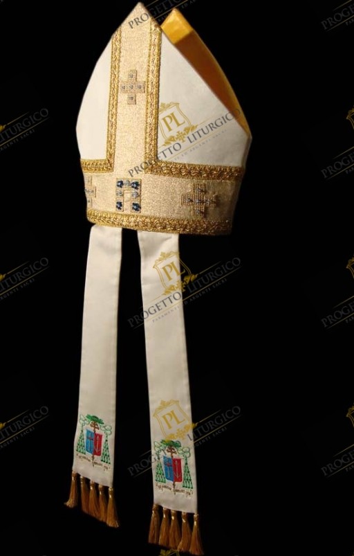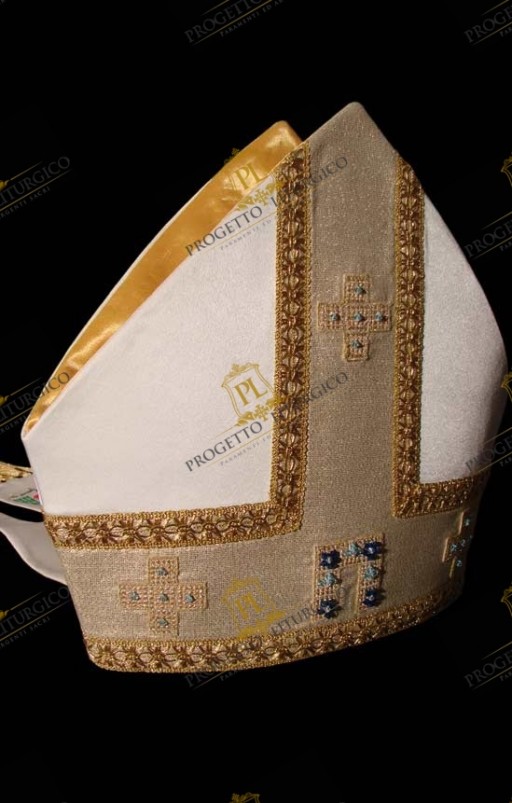 Questa mitria vescovile rinascimentale realizzata in tessuto cady di misto seta, presenta una elegante decorazione dai colori tipici mariani. Essa è caratterizzata da un tessuto di contrasto in laminato dorato, percorso da un delicato agremano traforato che mette in risalto le croci ricamate. L' elemento centrale della decorazione ha la forma stilizzata di una porta che simboleggia Maria, porta del cielo.