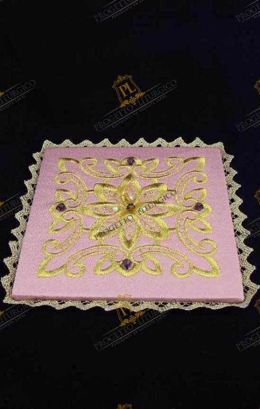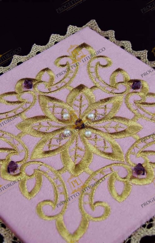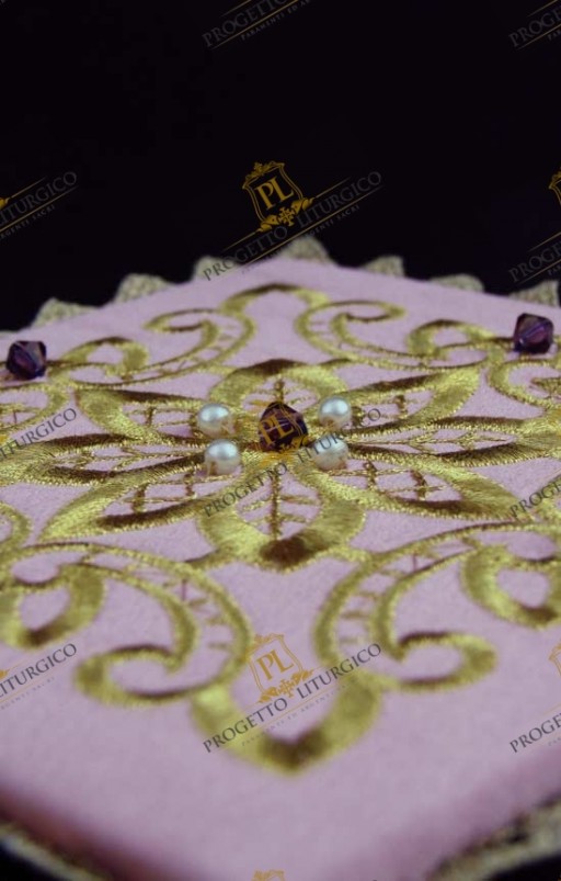 E' decorata con un ricco ricamo dorato questa bella palla copricalice rosa. Essa è realizzata in cady di misto seta di colore rosa e decorata con un prezioso ricamo realizzato in filato dorato. Cristalli color ametista e perline di fiume mettono in risalto particolarità del ricamo.