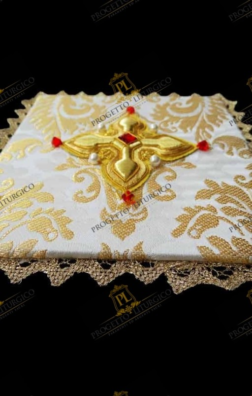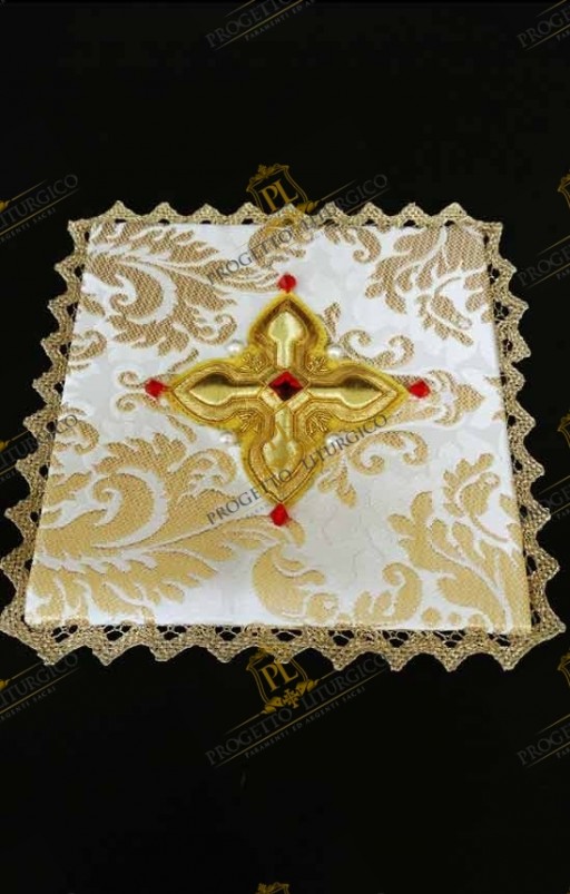 Impreziosita con pochi cristalli rossi e qualche perla bianca, circondata da un delicato bordo in tombolo, la croce diventa il fulcro di questa meravigliosa palla copricalice in tessuto barocco, da impiegare in celebrazioni liturgiche solenni.