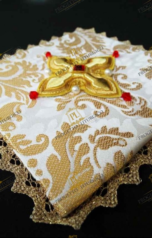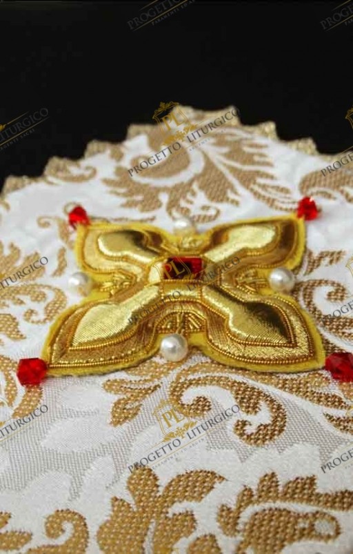 Questa preziosa palla copricalice è realizzata con tessuto broccato oro su sfondo bianco dal disegno barocco. L'unico ornamento della palla copricalice è la croce dorata che già da sola rappresenta un pezzo di pregio poiché realizzata a mano e rifinita con canutiglia dorata.