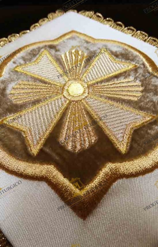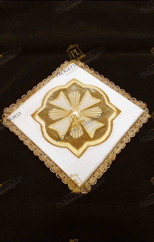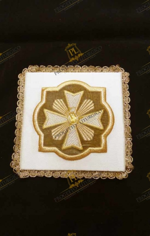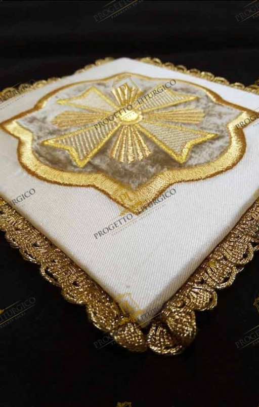 La palla copricalice morello che qui presentiamo è realizzata in preziosa seta shantung tutta ricamata con un motivo barocco molto ricco. Esso è realizzato con filato metallico color oro che dona luce e preziosità alla palla. Un cristallo color ametista cucito a mano al centro del ricamo dono un tocco in più di preziosità alla palla copricalice morello.