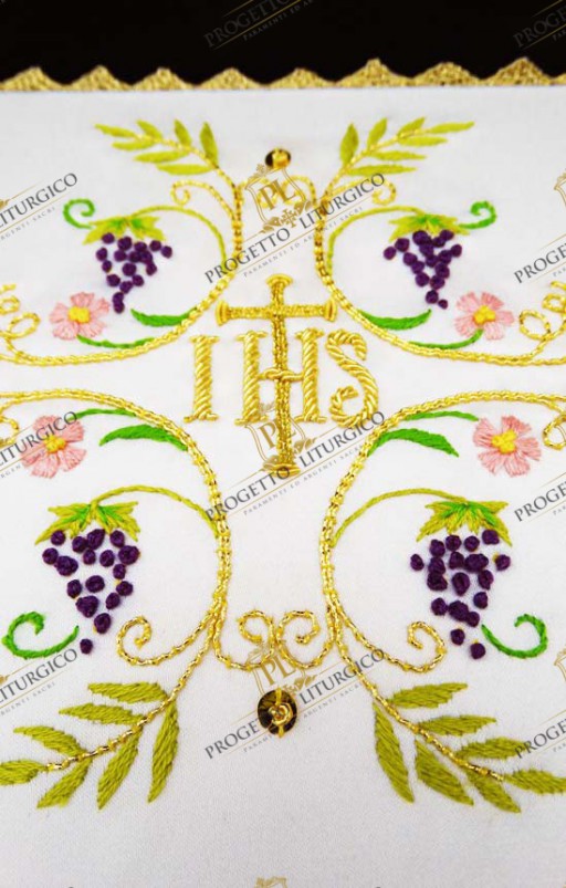 Impreziosita con pochi cristalli rossi e qualche perla bianca, circondata da un delicato bordo in tombolo, la croce diventa il fulcro di questa meravigliosa palla copricalice in tessuto barocco, da impiegare in celebrazioni liturgiche solenni.