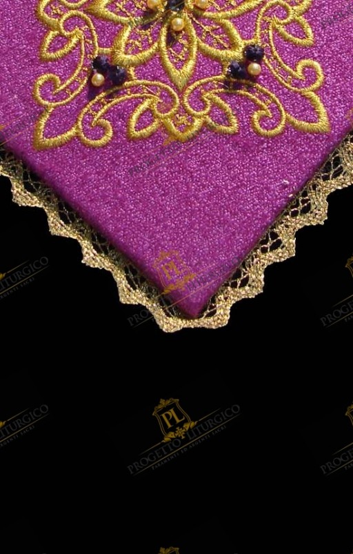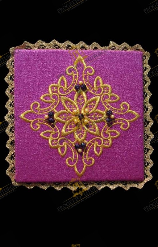 E' realizzata con un pregiato tessuto di seta e lana questa palla copricalice morello rigida. La decorazione è costituita da un ricamo dal disegno barocco, eseguito con filato metallico color oro e impreziosito attraverso l'applicazione, a mano, di piccole perle e cristalli di colore viola.
