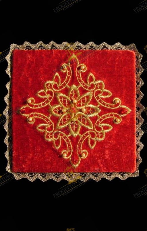 La palla copricalice rossa che qui presentiamo è realizzata in prezioso tessuto di velluto e finemente ricamata con filato dorato.