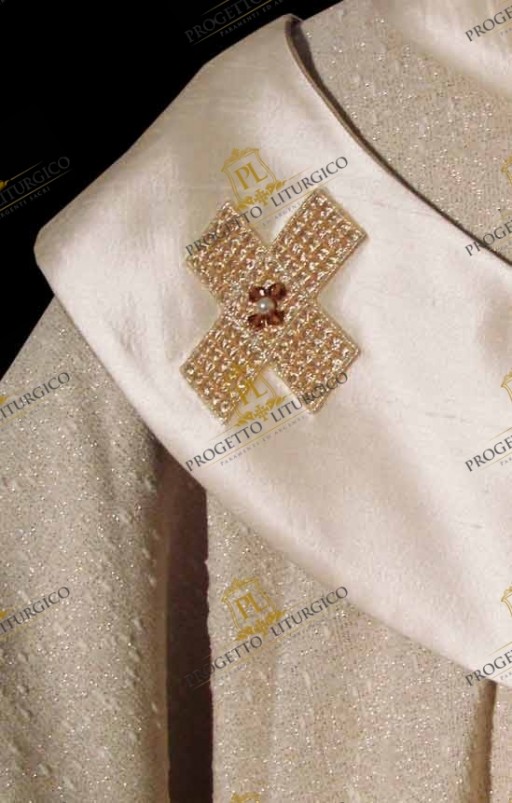 All'altezza delle spalle e sulla lunghezza del pallio per casula, trovano posto delle croci greche impreziosite con cristalli color topazio e perle.