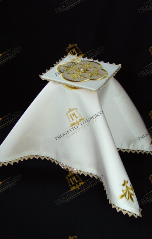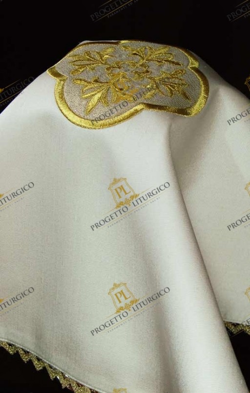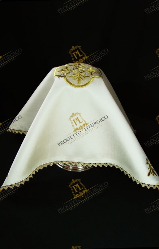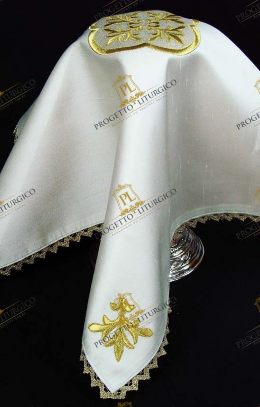 Il velo del calice che qui presentiamo è realizzato in candida seta shantung, foderata con raso dorato.