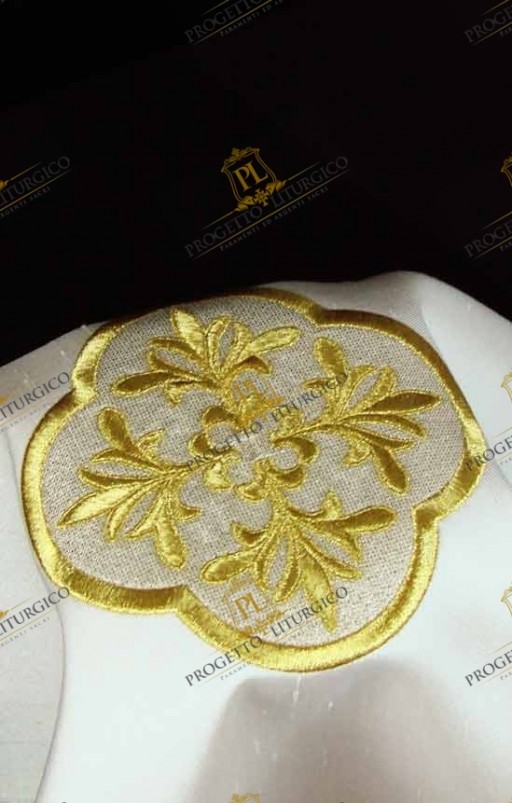 Al centro del velo vi è un prezioso ricamo, una bella croce gigliata, intorno alla quale si sviluppa una cornice dorata dalle forme arrotondate. Gigli, simbolo di purezza per eccellenza, sono anche ricamati ai quattro angoli del velo del calice.