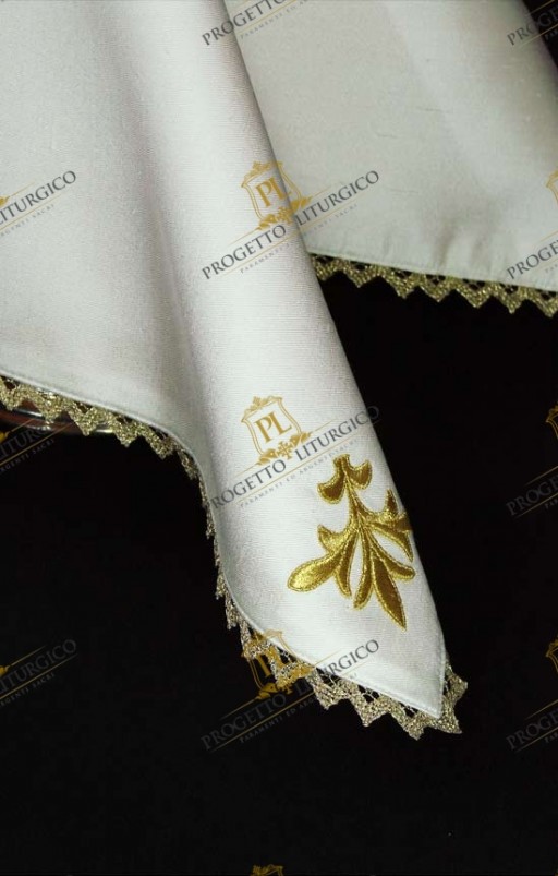 Percorre tutto il velo del calice un discreto bordo in tombolo dai delicati toni dorati.
