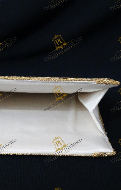 A fare da cornice, un delicato agremano sui toni del dorato cucito a mano che rende ulteriormente preziosa questa borsa del corporale.