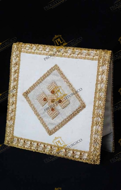 La borsa del corporale è realizzata interamente in seta shantung, compreso l'interno così come prescritto dalle norme. Esternamente la borsa del corporale è impreziosita da un gioco di sovrapposizione di tessuti, il cui punto focale è la croce centrale ricamata in filato dorato. A donare luce alla croce ci sono i cristalli del colore del topazio, che impreziosiscono l'intera decorazione.