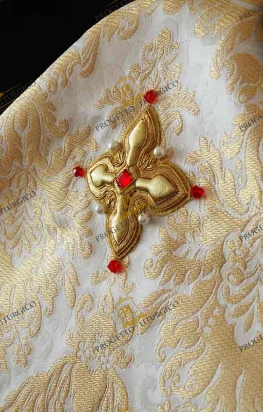 Questo prezioso velo del calice è realizzato in pregiato tessuto broccato dorato su sfondo bianco. Il velo è decorato semplicemente con una bella croce realizzata a mano, impreziosita con canutiglia, cristalli rossi e perle.