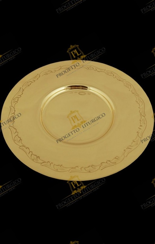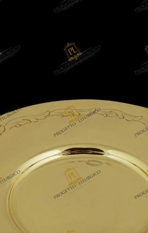 Bellissima patena in argento 800, realizzata completamente a mano e impreziosita con ceselli lungo tutto il bordo che la rendono un pezzo unico e pregiato.