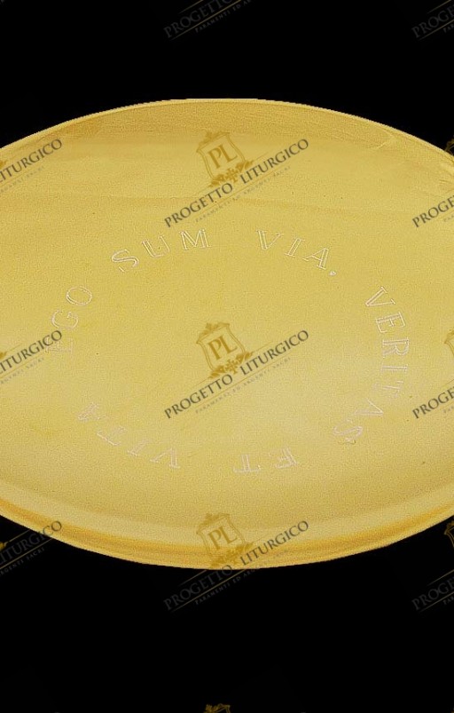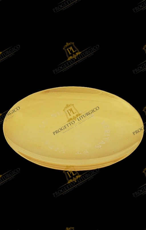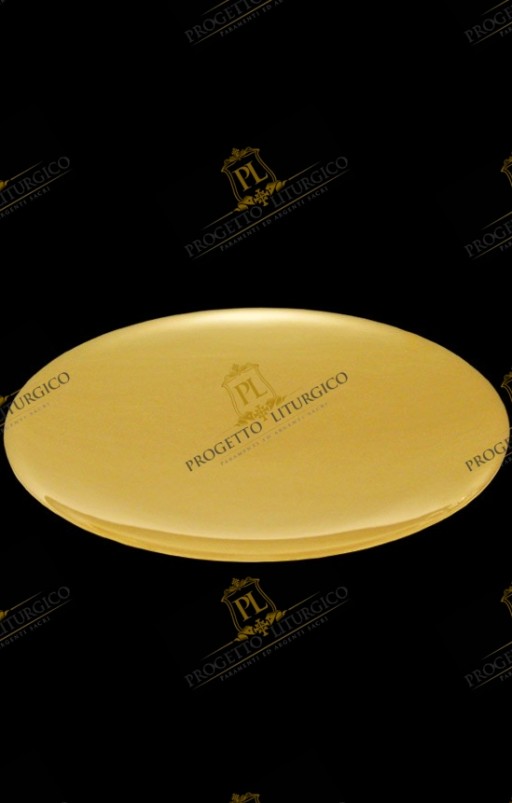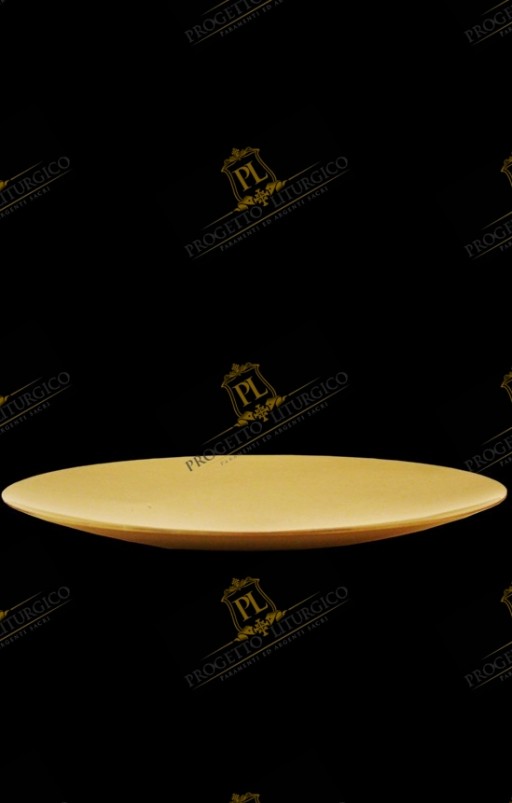 La patena in argento dorato che qui vediamo è caratterizzata da una forma liscia, senza fondo, detta "a lenticchia". Si tratta di una patena in argento cesellato completamente a mano, dalla forma elegante ed essenziale. Il prezioso metallo con cui è interamente realizzata questa patena è reso dorato grazie al bagno in oro.