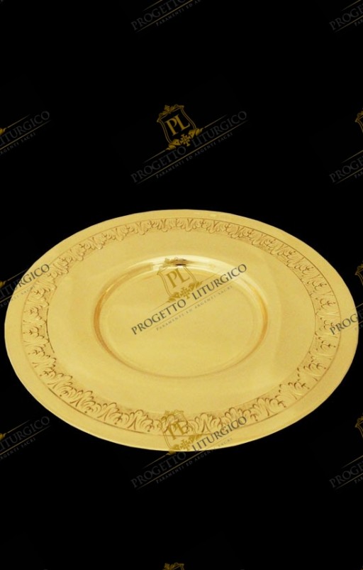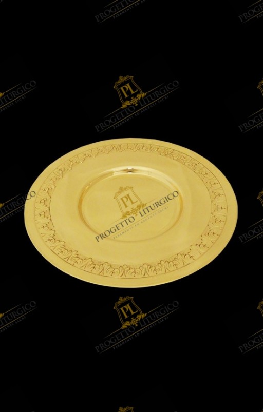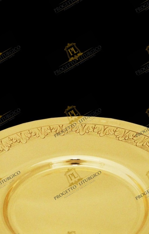 La patena ha la classica forma, con il fondo, è dorata e presenta un grazioso cesello lungo tutto il bordo esterno che la rende più personale e più preziosa.
