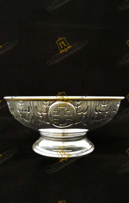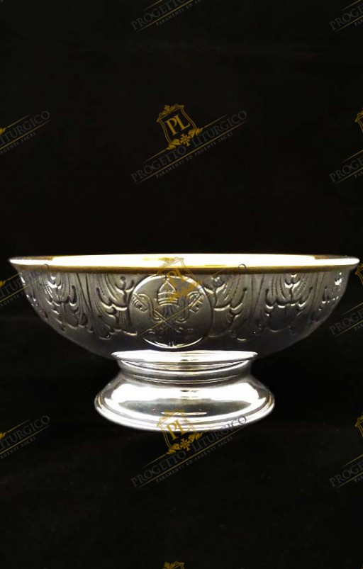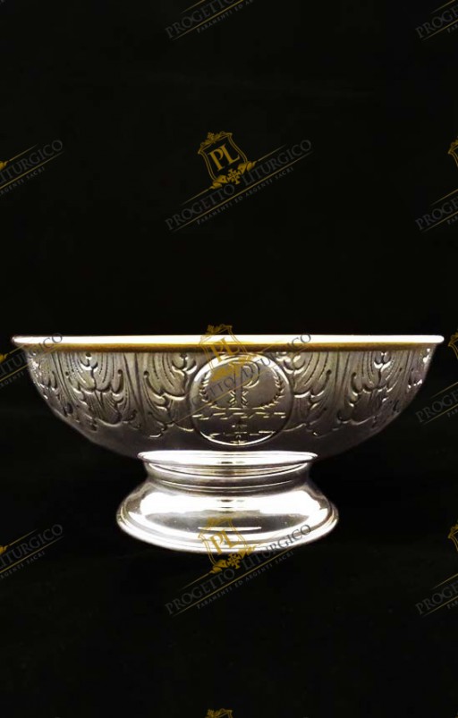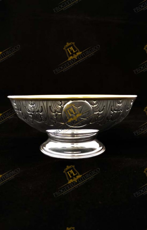 La patena ha la classica forma, con il fondo, è dorata e presenta un grazioso cesello lungo tutto il bordo esterno che la rende più personale e più preziosa.