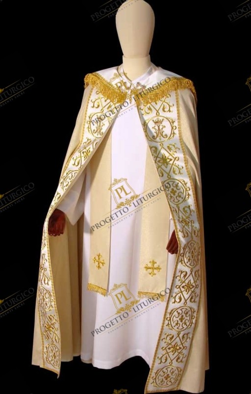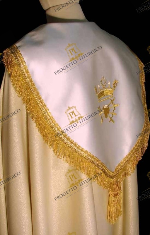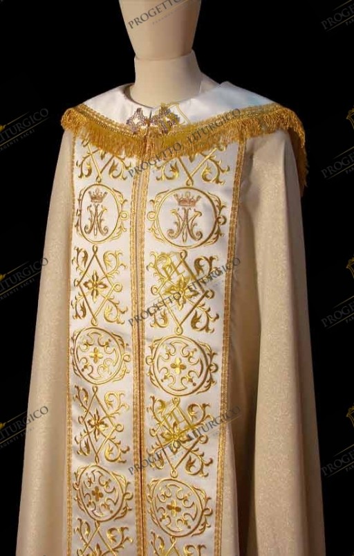 Contrariamente ai soliti piviali mariani realizzati sui toni dell'azzurro, questo piviale mariano è realizzato in una morbida lana papale dorata. Sul davanti, due fasce in tessuto di raso bianco sono riccamente ricamate con motivi barocchi alternati, tra cui si distingue, all'altezza del petto il monogramma mariano. Un discreto agremano dorato percorre le due fasce.