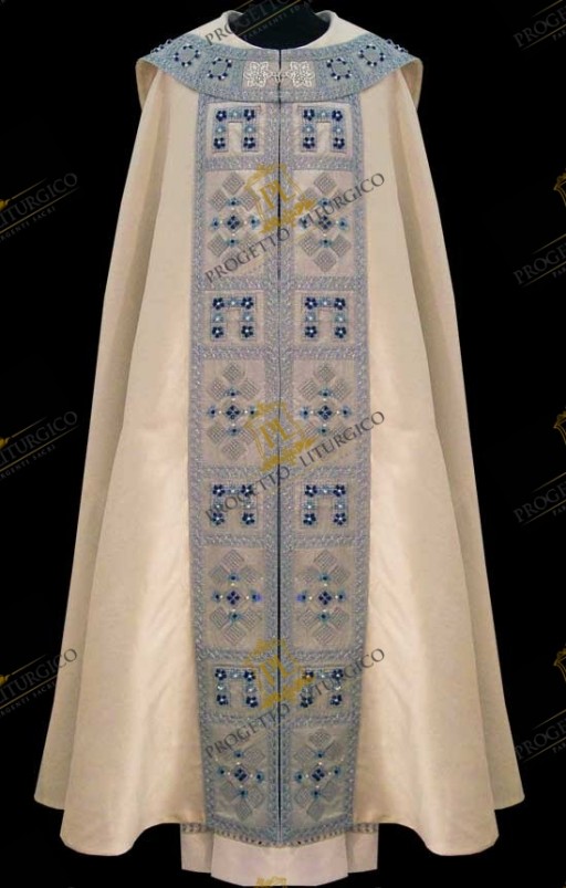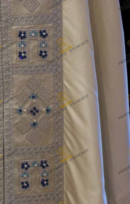 La porta e il giglio sono resi in maniera stilizzata attraverso elementi ricamati arricchiti con perle e cristalli, ora acquamarina ora blu. Questi due elementi tipici della simbologia mariana sono collocati alternativamente sulle due fasce in tessuto laminato oro bianco che decorano il davanti del piviale, intervallati da un delicato agremano color argento.