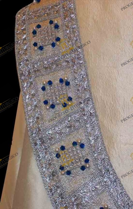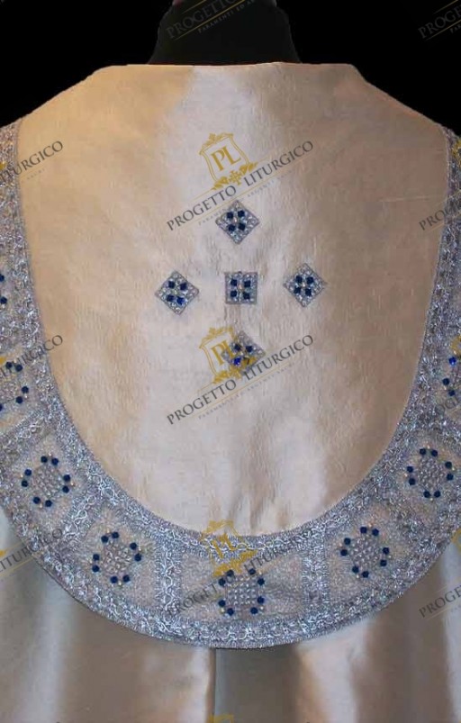 Lo stesso prezioso agremano argentato impreziosisce lo scudo tondo del piviale bianco mariano, il quale presenta una ricca decorazione geometrica composta da elementi ricamati e cristalli blu e perle bianche. Al centro dello scudo è collocata una croce.