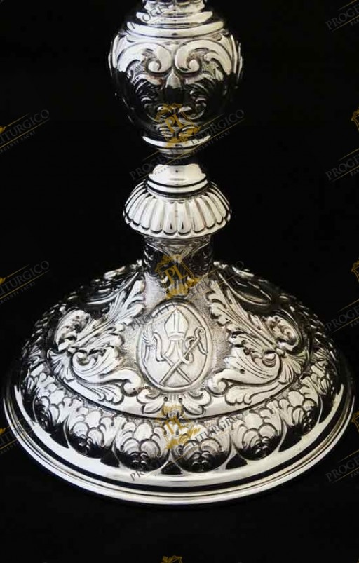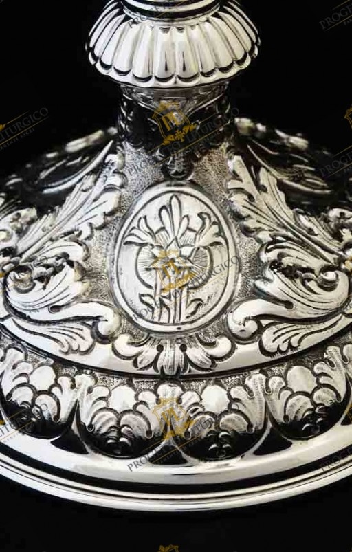 The whole silver chalice is decorated in Baroque style, from the cup to the base, passing through the tapered stem. Floral elements, thus, frame the more particular and personal decorative elements, chosen exclusively by the client. Thus, a silver chalice can tell a personal story, or celebrate particular moments, bearing the devotion of the priest who uses the chalice imprinted on the sacred vessel.
