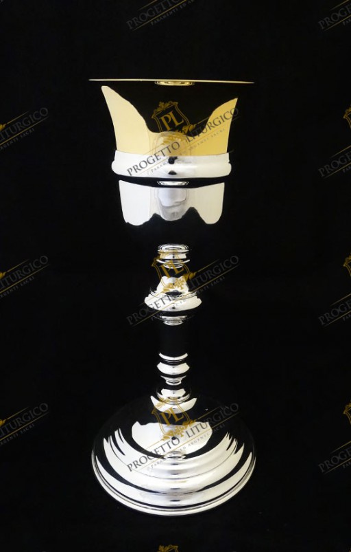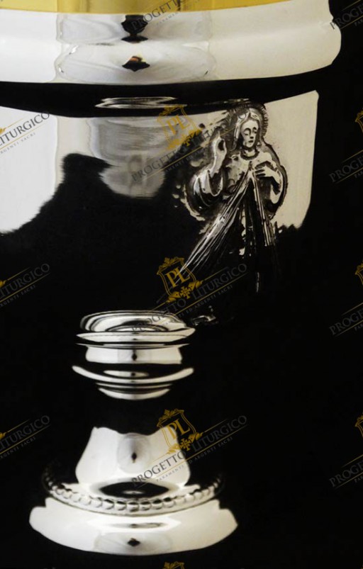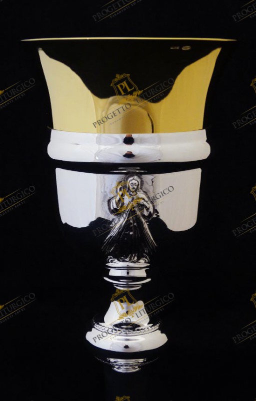The simple priestly chalice of Divine Mercy is made entirely of silver. It is a smooth chalice, beautiful in its essentiality. The only personalized decorations concern the saucer and the base of the simple priestly chalice.