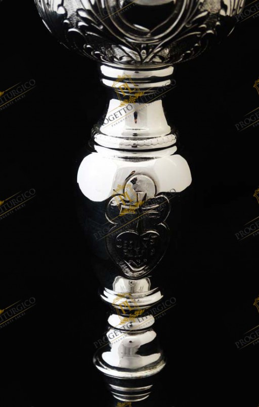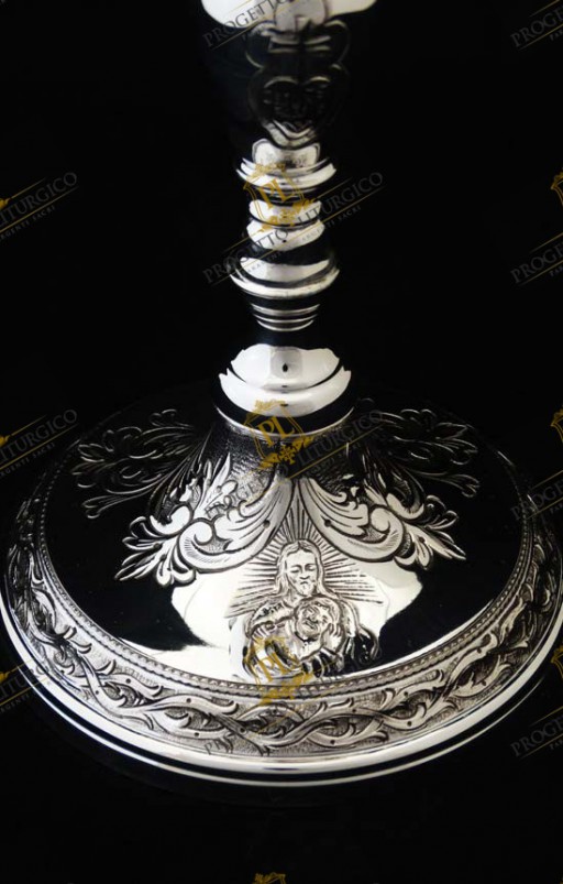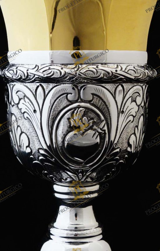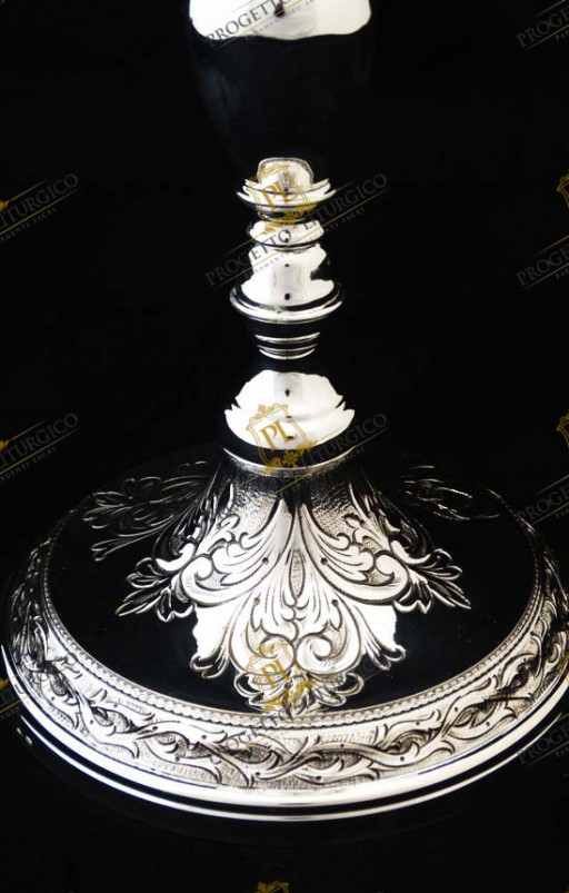 The mass chalice is made entirely of silver, hand-chiseled in the Baroque style. Some symbols of the Passion of Jesus are highlighted on the saucer. On the base, however, other chisels personalize this wonderful silver chalice.