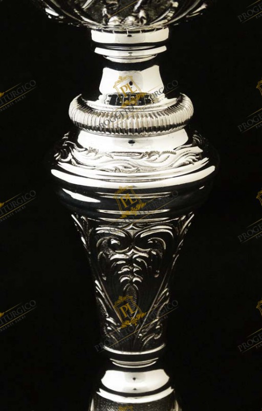 Each component of the chalice is made of hand-chiseled silver. The style of the chisel is the Baroque one, therefore characterized by soft lines that take inspiration from the floral world.