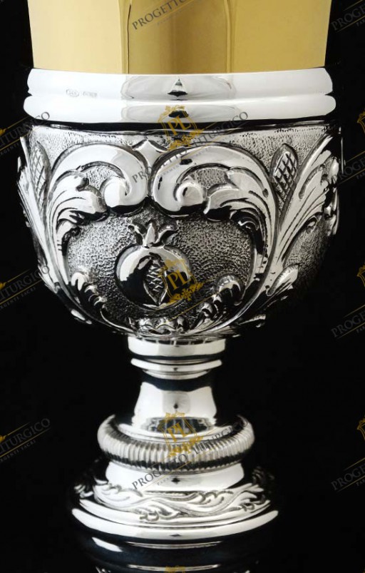 The liturgical chalice for mass, has some personalized motifs set in the decorative motifs that characterize the chalice. Among these personalized motifs stand out the Lamb and the pomegranate, both chiseled on the cup.