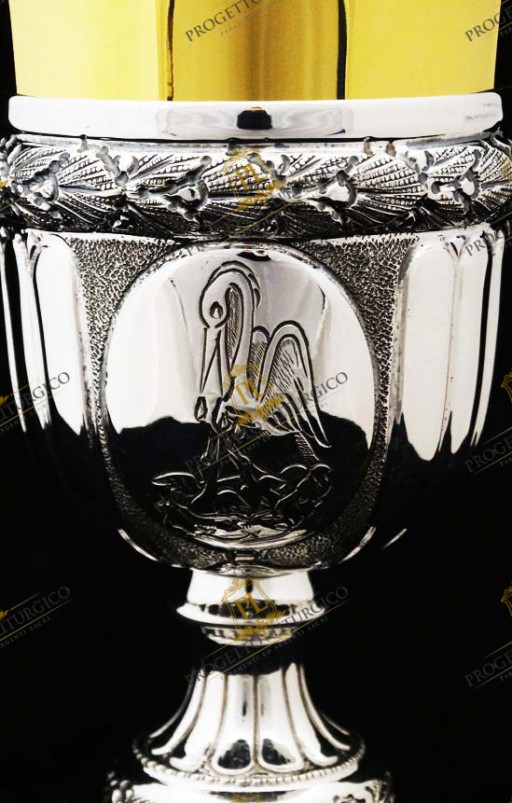 The simple silver mass chalice PL163 features a beautiful engraved pelican on the saucer, surrounded by classic decorative elements.