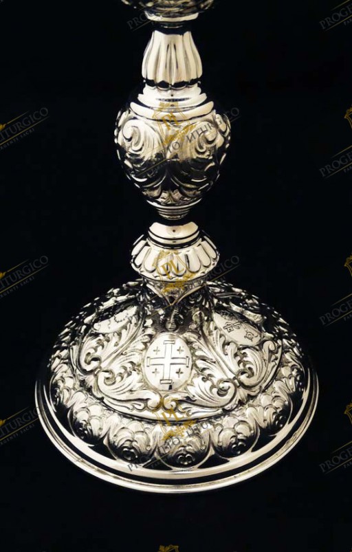 Thus, on the cup we find the symbols of the Passion of Christ: the crown of thorns, the nails and the whip, engraved on ovals inserted in the floral decoration of the baroque silver chalice. On the base, on the other hand, the crosses of the Order of the Holy Sepulcher of Jerusalem, the cross of the Order of Malta, the papal symbol and the customer's personal symbol are engraved.