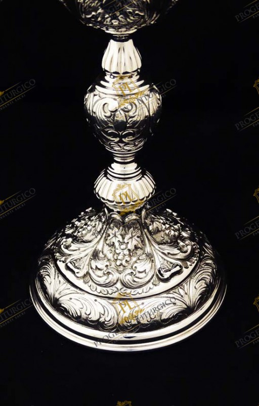 The same bunches of grapes are chiseled on the wonderful base of this splendid silver liturgical chalice.