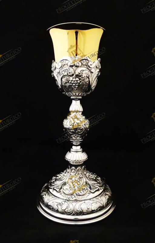The silver liturgical chalice is hand-chiseled in the classic Baroque style, with soft shapes inspired by the floral world. Within the narrative complex of the decoration, we find personalized elements, which make this silver liturgical chalice unique.
