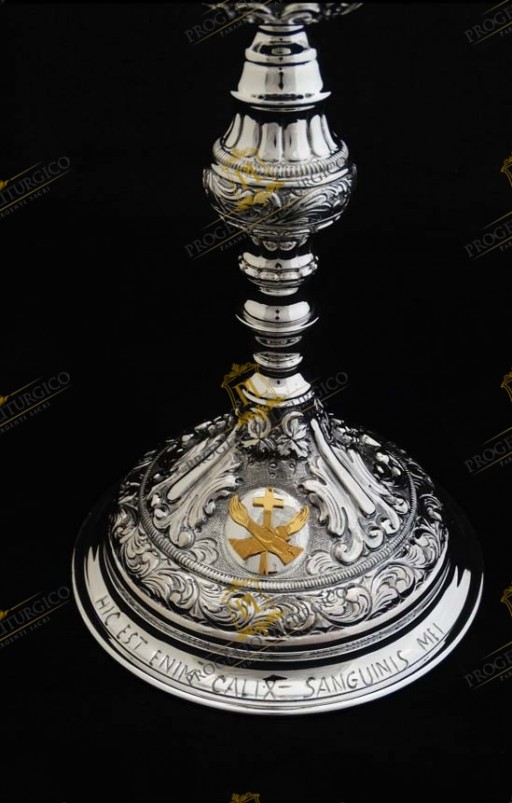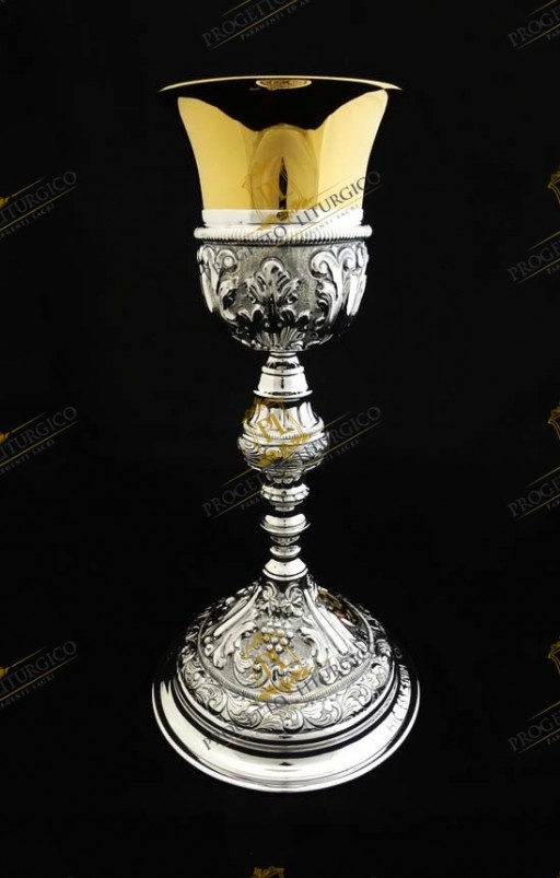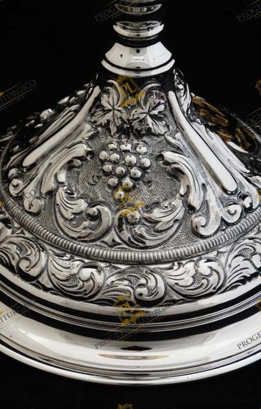 This precious silver liturgical chalice is made entirely by hand in the Baroque style. The silver liturgical chalice is a simple chalice overall, even if it has chisels typical of the Baroque style, such as the plant elements and bunches of grapes that make it very precious.